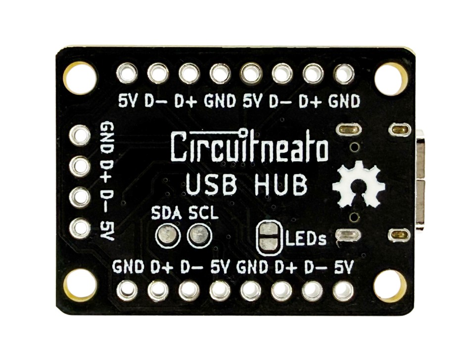 Like for the Mini USB Hub, the SDA and SCL pads are for an external EEPROM chip to be connected. See more in the “Features” section.